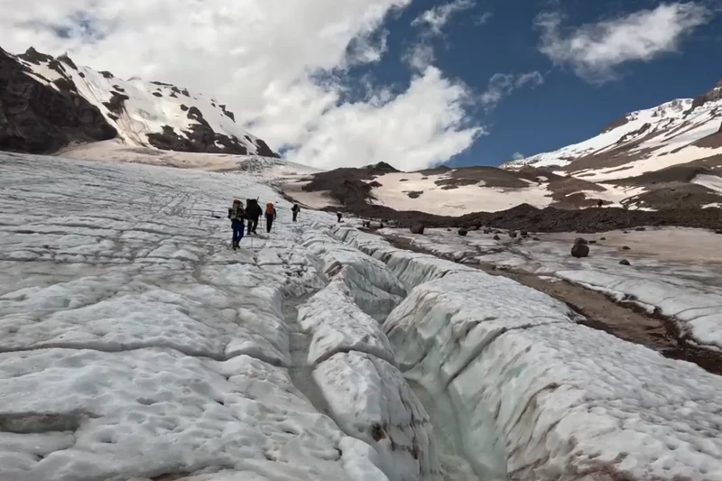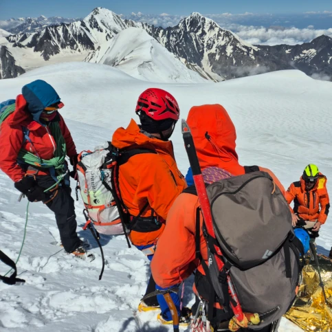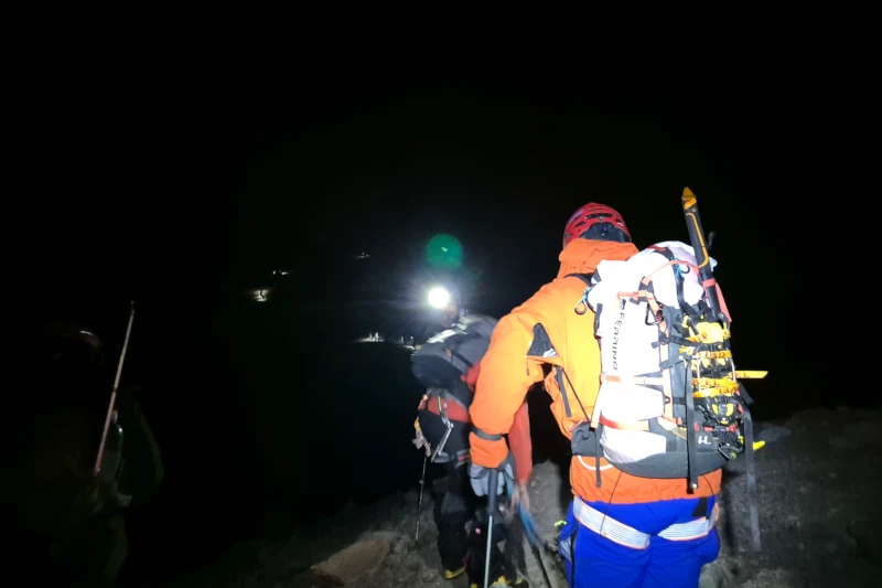 Zejście z przygodami. Ktoś niestety poleciał, więc zboczyliśmy ze szlaku, żeby pomóc. Na szczęście zeszło również kilku innych przewodników, toteż od razu rozpoczęło się poszukiwanie zasięgu. Po kilku godzinach, przemarznięci po długim postoju na lodowcu, z kilkoma innymi zespołami połączyliśmy się w dwie duże grupy i zeszliśmy do Meteo, kiedy reszta przewodników została przy tym człowieku ze złamaną kostką.