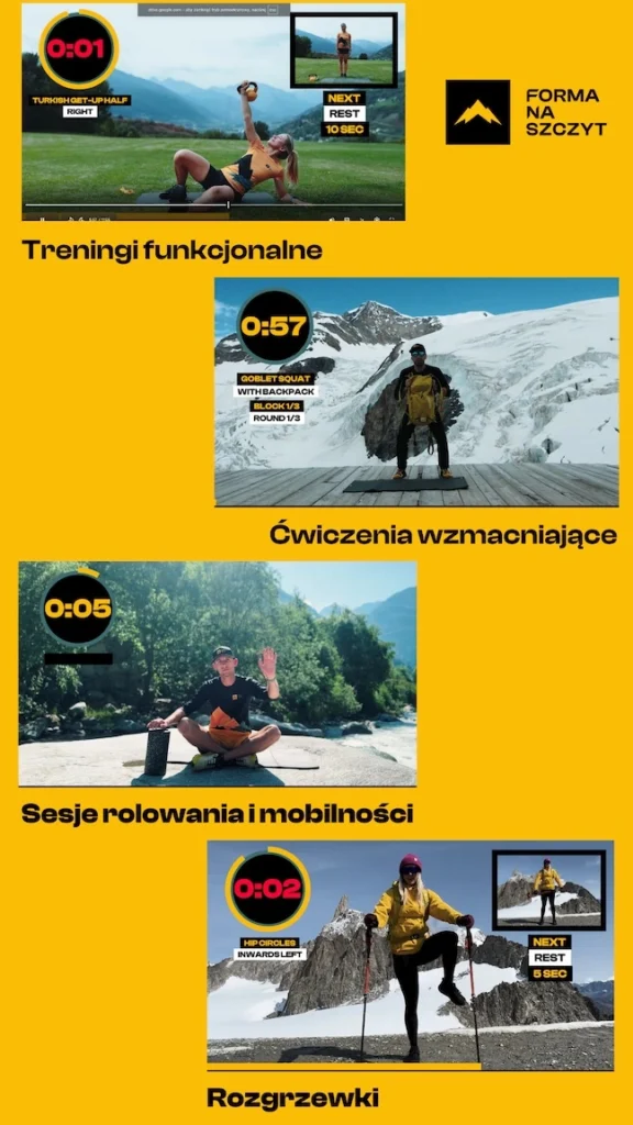 W aplikacji treningowej otrzymujesz dostęp do wyjątkowych treningów wideo nagranych w spektakularnych górskich lokalizacjach. Treningi są stworzone stricte pod góry i biegi górskie.